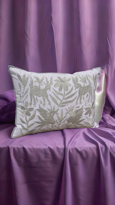 Cojín Otomí Lumbar Bordado Flora y FaunaGris/Bugambilia