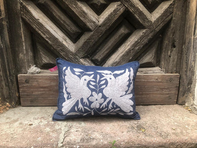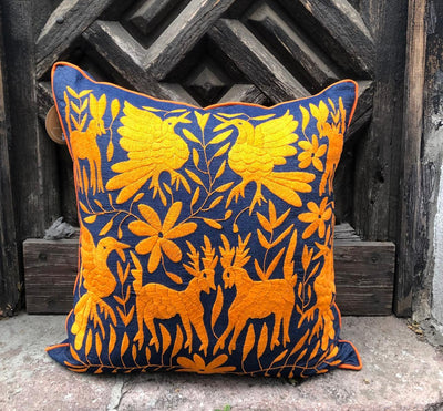 Cojín Otomí Bordado Flora y FaunaAzul marino