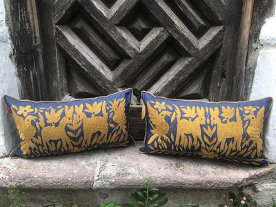 Cojín Otomí Bordado Flora y FaunaOro/Mezclilla