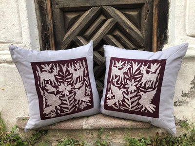 Cojín Otomí Bordado Flora y FaunaBeige/Vino