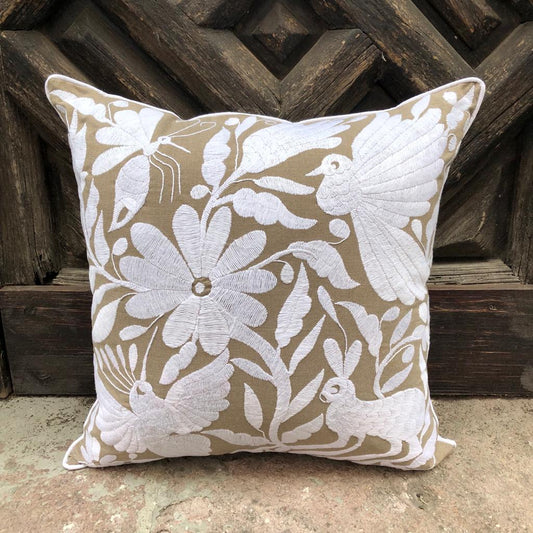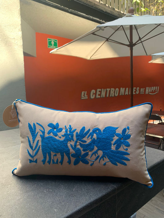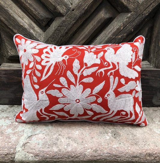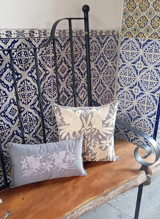Cojín Otomí Lumbar Bordado Flora y Fauna Centrado